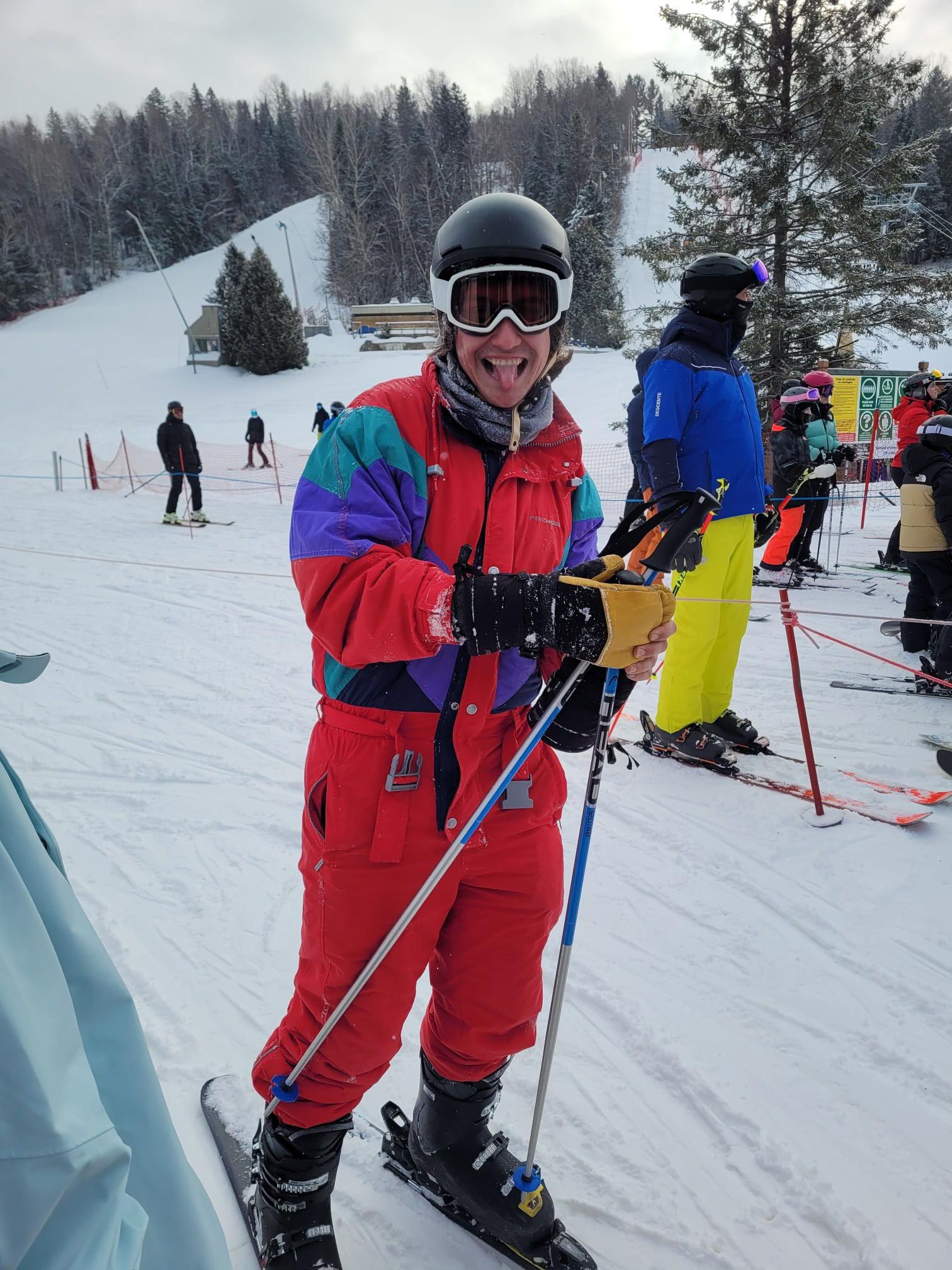 I picked up lots of dropped items for people, held doors, etc, leading to many a merci. Meanwhile, this guy is out here in his onesie escaping the bunny slope and hamming down sandwiches