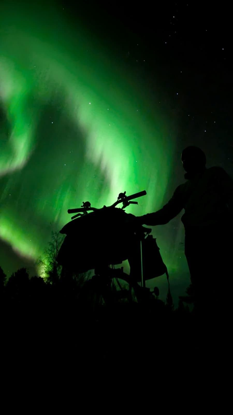 While there was no cabin, the view of the aurora was amazing. As I was riding to the lake, it fully opened up on top of me, leading to Martin capturing an amazing shot of my Brompton.